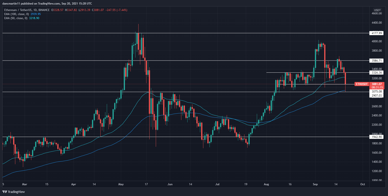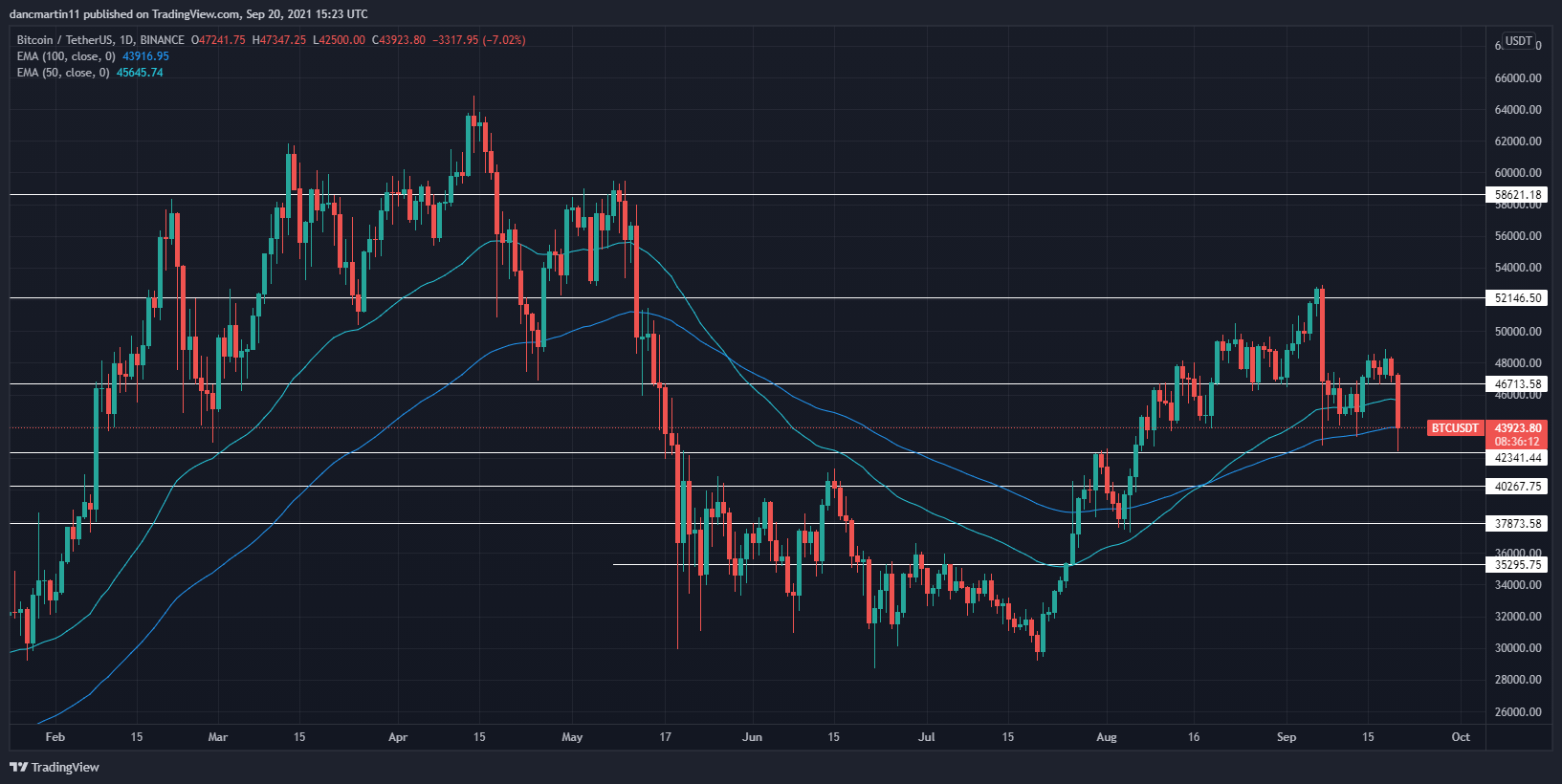 Bitcoin se encuentra en una zona de soporte importante cerca de los $43,000 (-7%), tras un desplome la madrugada de hoy que llegó hasta los $42,500. Actualmente se encuentra rebotando en su media móvil de 100 periodos, por lo que podemos concluir que nos encontramos cerca de un nivel decisivo en el cual podremos ver una nueva tendencia bajista, o una continuación de su tendencia previa.