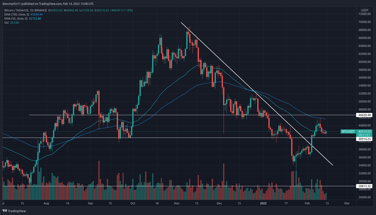 Bitcoin se encuentra cerca de los $42,400, muy cerca de una zona de soporte la cual podría funcionar como punto de apoyo para continuar con el inicio de una nueva tendencia alcista.