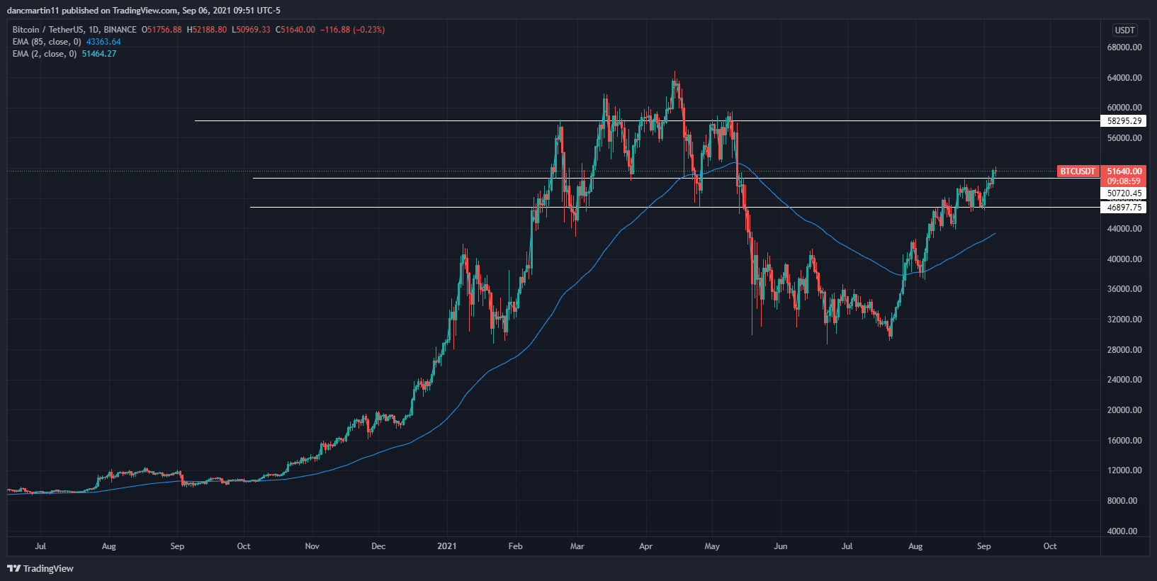 Bitcoin por fin ha vulnerado los $50,000, por lo que podríamos ver un rally hasta un siguiente nivel de resistencia en $58,000, siempre y cuando se defina el precio por encima de los $53,000, que es el nivel con un poco mas de congestión.