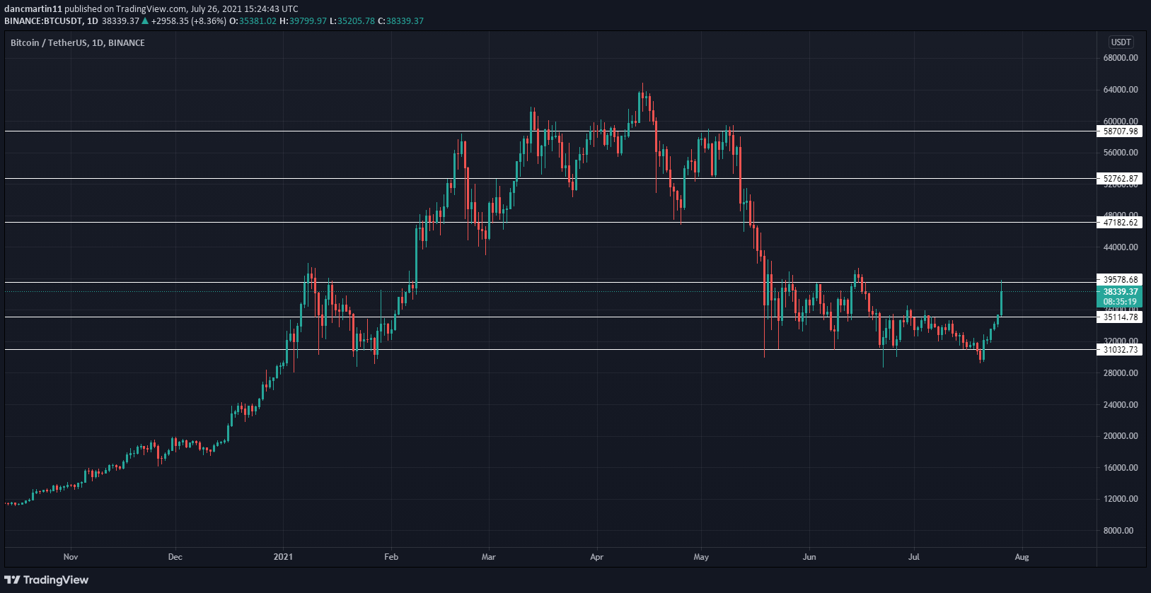 En cuestión de horas, esta madrugada el Bitcoin, Ethereum, y otras cripto se dispararon más de un 10%, alcanzando máximos que no se habían visto desde hace más de seis semanas. El Bitcoin rebasó los $38,000 USD, mientras que Ethereum superó los $2300 USD. Entonces les pregunto smartraders, ¿No vendieron sus criptomonedas verdad? 👀