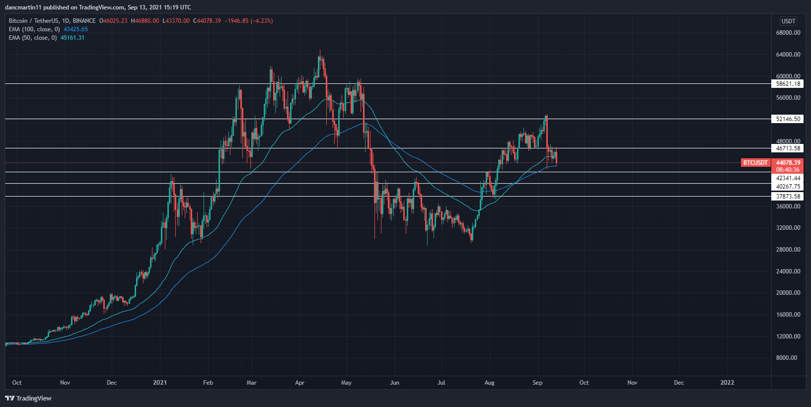 El pasado martes 7 de septiembre entró en vigencia la ley que reconoció al Bitcoin como una moneda de curso legal en El Salvador, luego de que su presidente, Nayib Bukele, anunciara que las reservas del país ahora contaban con 550 BTC tras una compra inicial de 400 BTC, seguida de una recompra tras el desplome de 150 BTC, reiterando su confianza en el criptoactivo con mayor capitalización en el mercado. En distintas comunidades de usuarios se denominó a este día como el Bitcoin Day, en el cual los mismos incentivaban a realizar compras masivas de Bitcoin con la finalidad de impulsar su precio al alza como celebración de dicho acontecimiento. Sin embargo, lo que menos se esperaba por parte de los retailers sucedió: El Bitcoin y la gran mayoría de los *alternative coins *cayeron más de un 10%.