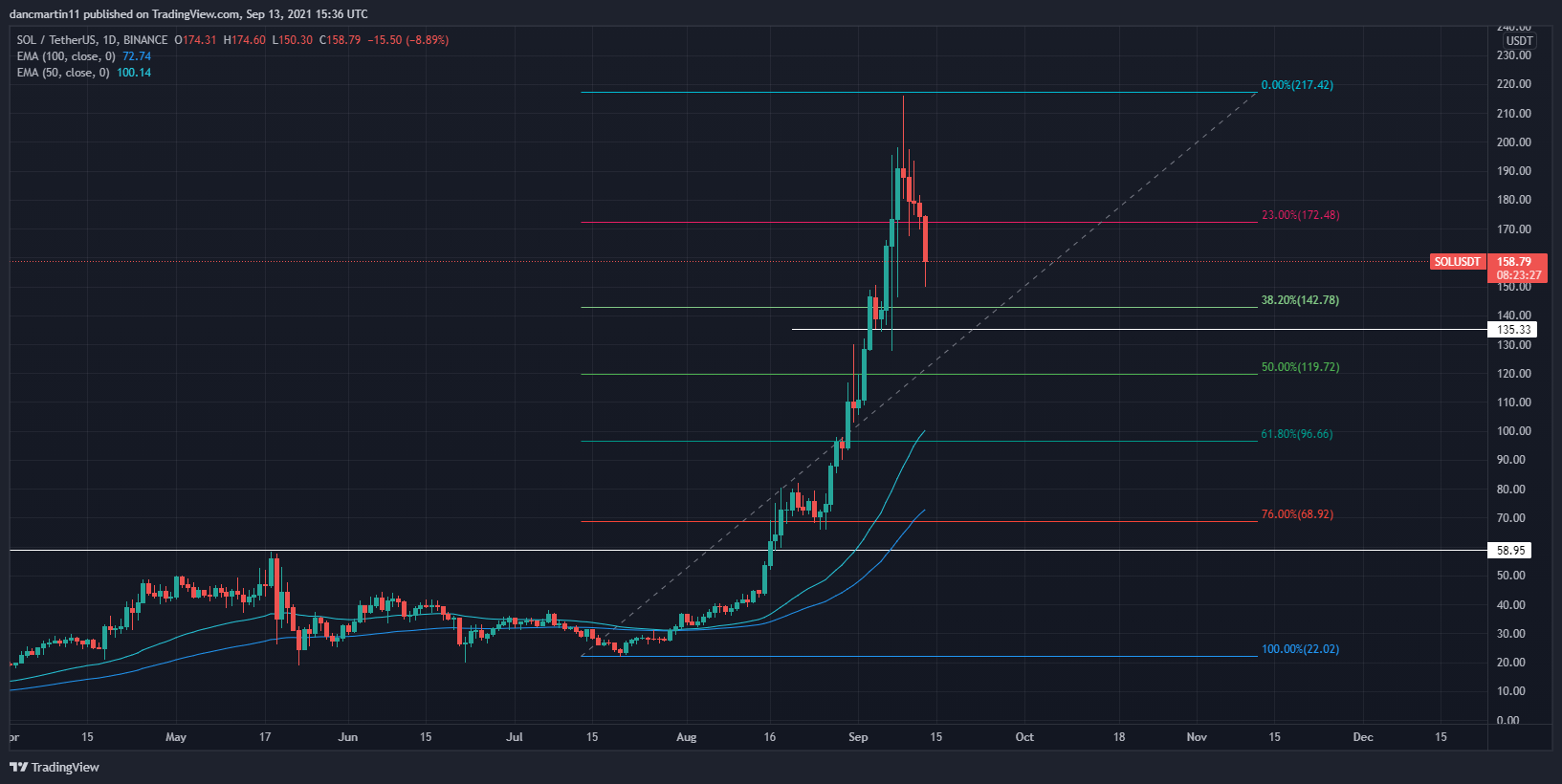 Por otro lado está Solana, que mientras la gran mayoría de los criptoactivos caían la semana pasada, esta incrementaba su valor más de un 50% llegando a un valor máximo de $216. Sin embargo y como era de esperarse, la corrección finalmente llegó y el activo se encuentra rondando los $158, por lo que los niveles de Fibonacci podrían ser bastante útiles para encontrar un nuevo nivel de compra.